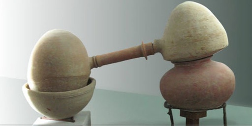 La primera descripción de un destilador es generalmente atribuida a un médico Español en los años 1200. Sin embargo un hallazgo en 1975 donde se descubrió un aparato de terracota perfectamente preservado, nos da otra visión de lo sucedido. Se presume que servía para preparar aguas aromáticas, y está datado cerca de los 3000 a.c. Hoy se exhibe en el museo de Taxila de Pakistan.